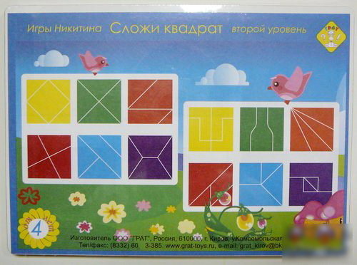 "Сложи квадрат" - знаменитая игра Никитина для развития интеллектуального потенциала малышей. Квадраты разрезаны на кусочки разной формы - чем выше уровень, тем больше составных частей в квадратах.
